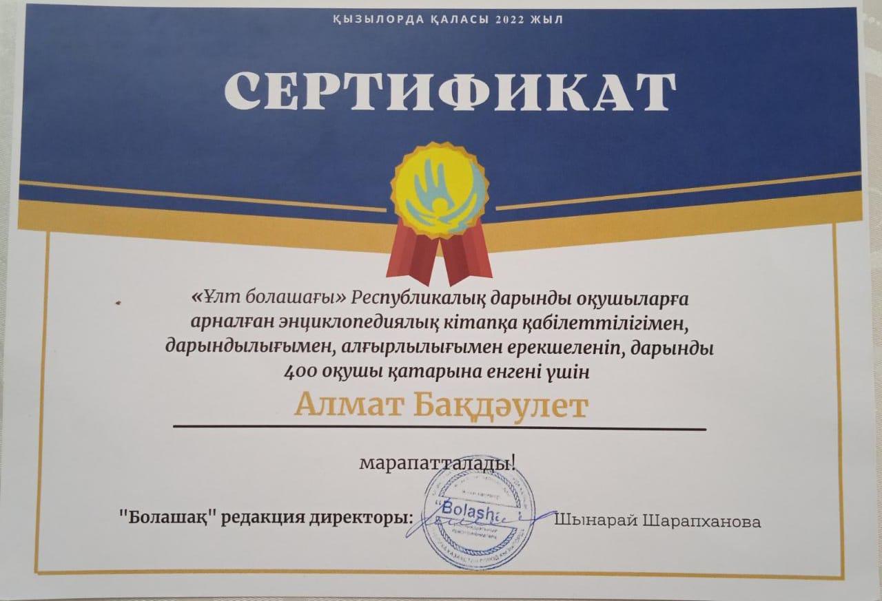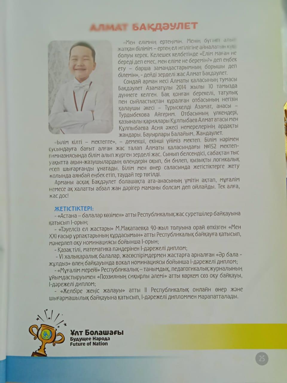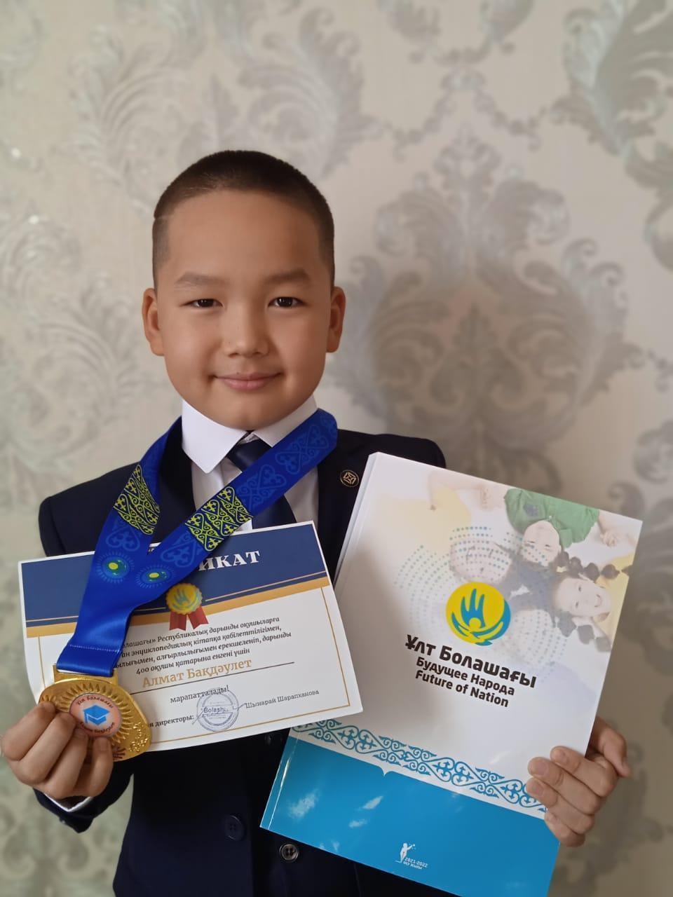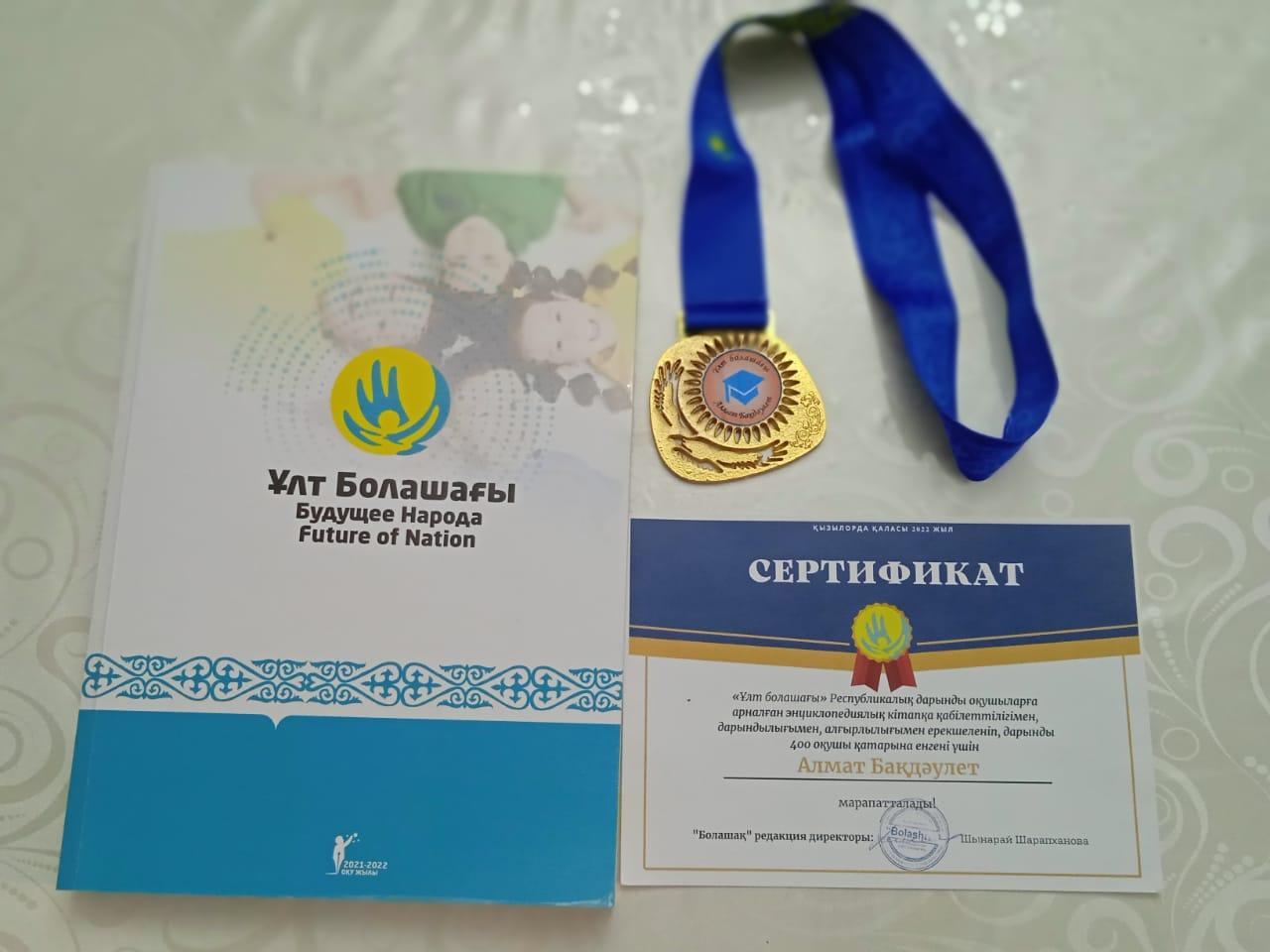 "Ұлт болашағы" Республикалық дарынды оқушыларға арналған энциклопедиялық кітапқа қабілетілігімен,дарындылығымен ,алғырлығымен , ең үздік 400 оқушының қатарына еніп 3"Д"сынып оқушысы Алмат Бақдәулет Азаматұлы арнайы "Ұлт болашағы" медальымен марапатталып , жеткен жетістіктерімен энциклопедиялық кітапқа шықты.