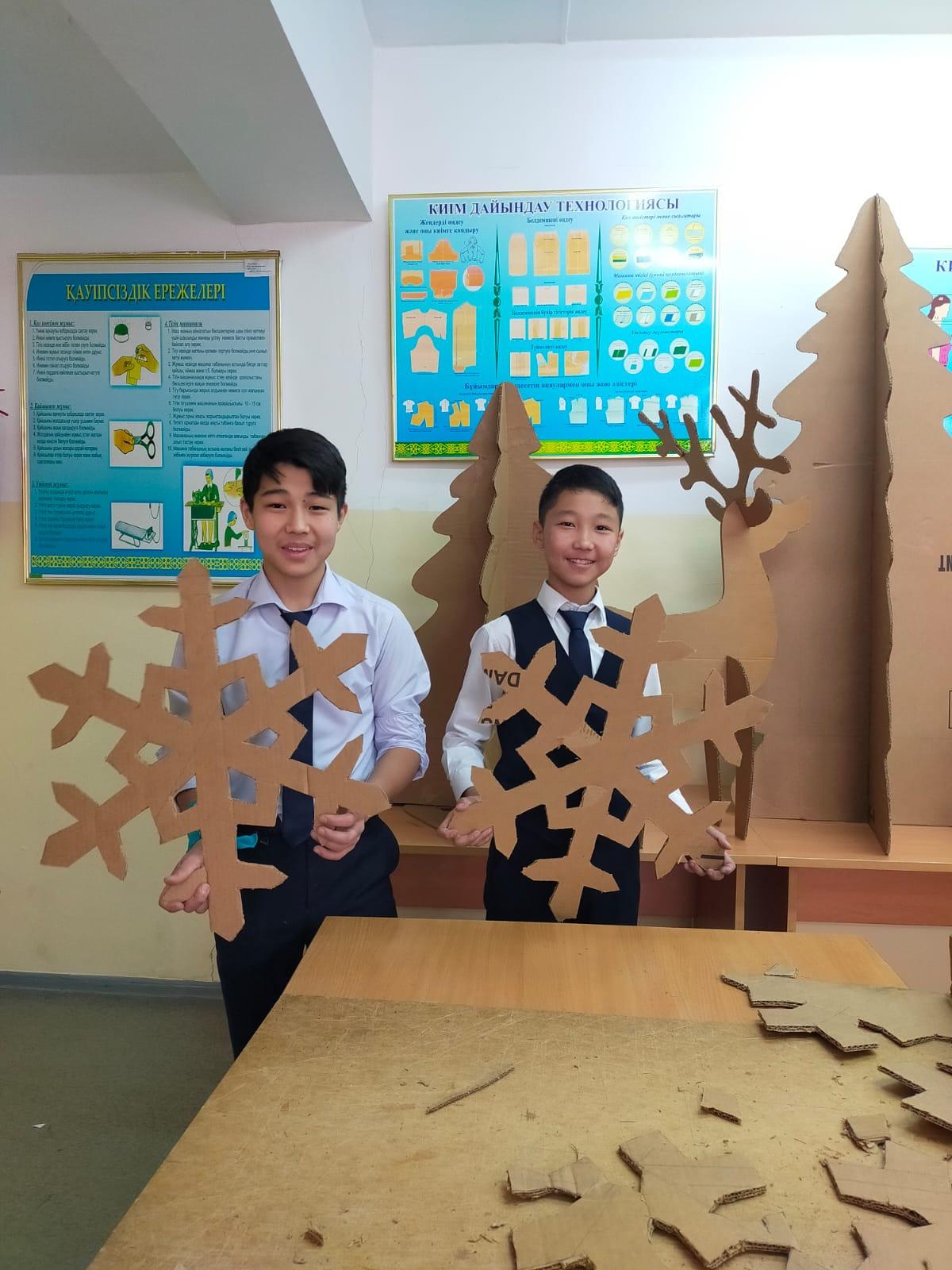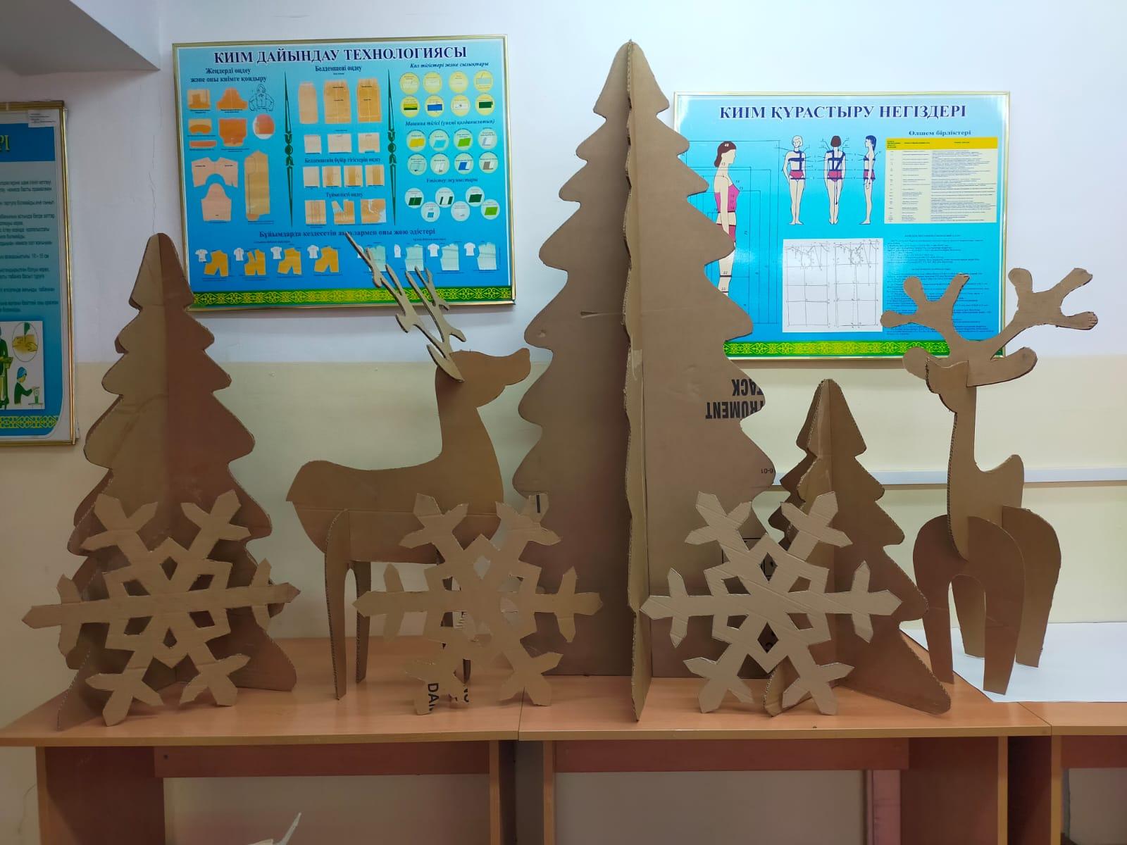 Шәкірттерімен бірге қағаз қалдықтарынан әр түрлі шығармашылық туындылар жасау арқылы оқушыларды икемділік пен шеберлікке тәрбиелеп, қалдық заттарға екінші өмір сыйлауды көркем еңбек пәні мұғалімдері естен шығарған емес. Жаңа жылдық мерекеге арналған көрме заттарын дайындау.