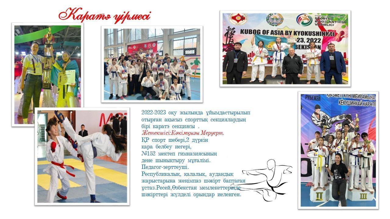 2022-2023 оқу жылында ұйымдастырылып отырған ақысыз спорттық секциялардың бірі каратэ секциясы . Жетекшісі : Кәкімқызы Меруерт. ҚР спорт шебері,2 дүркін қара белбеу иегері,№ 152 мектеп гимназиясының дене шынықтыру мұғалімі.Педагог-зерттеуші. Республикалық,қалалық,аудандық жарыстарына жеңімпаз шәкірт баптаған ұстаз.Ресей,Өзбекстан мемлекеттерінде шәкірттері жүлделі орындар иеленген.