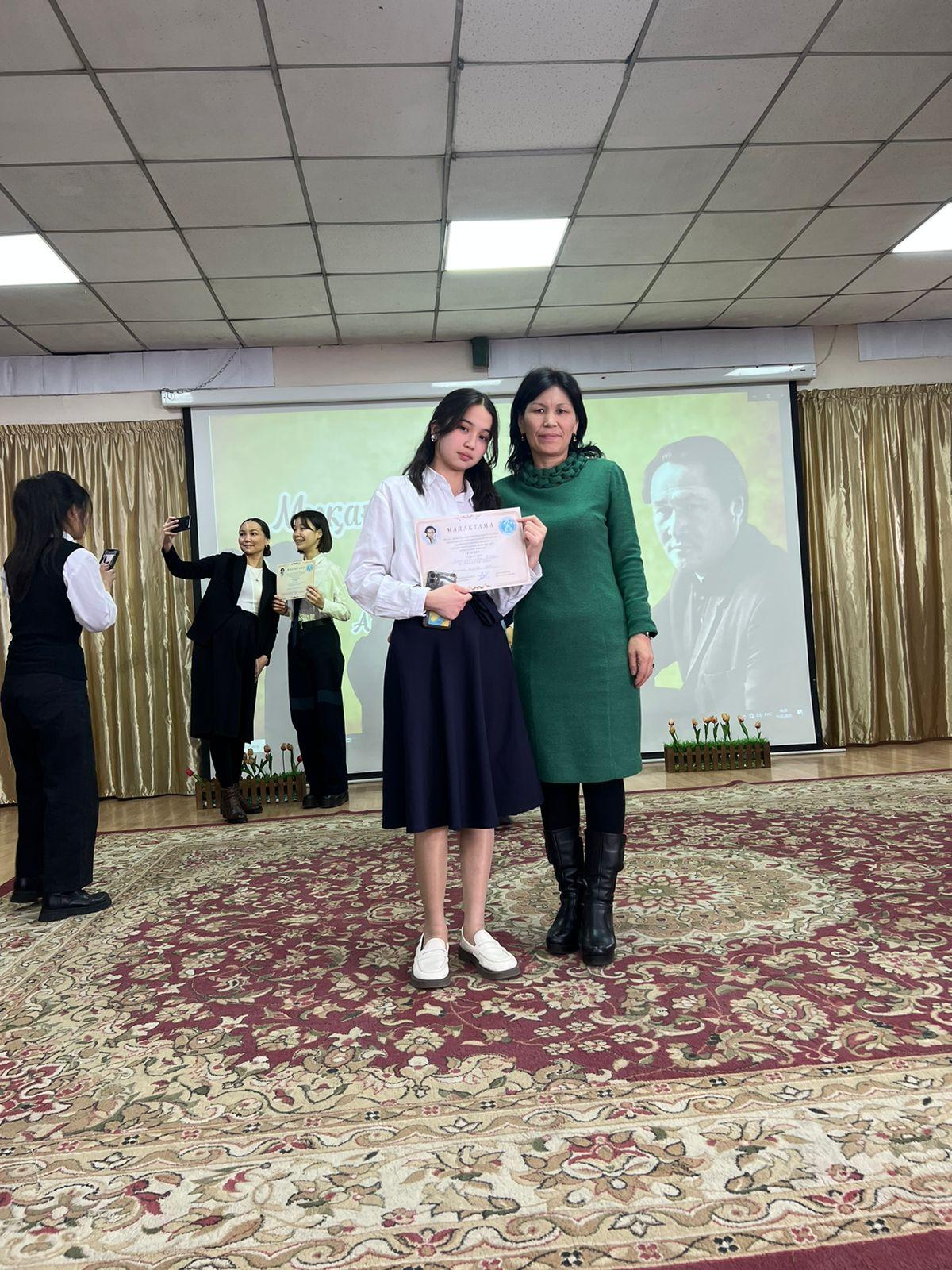 152 мектеп - гимназияның дүлдүлi! Алматы қаласы Алатау аудандық Бiлiм бөлімінің ұйымдастыруымен 8-11 сынып оқушылары арасында Мұқағали Мақатаев оқулары болып өтті. Осы байқаудың “Айтып өткен ақында арман бар ма? ” бөлімі бойынша қатысқан жан - жақты қабiлеттi, дарынды 8 "А" сынып оқушысы Джалгасбекова Айару ақынның 100 өлеңін жаттап, I орын иегері атанды. Өлең оқу шеберлiгiмен қатар, 100 өлеңдi шатастырмай, нақышына келтіре орындаған жас дарын көпшіліктi тамсандырды. Кез келген бәсекеде озық шығатын Айару қалалық жарыстанда қанжығалы оралып, аудан мерейiн көтереді деген сенімдеміз! "Ұстазы мықтының ұстамы - ұстанымы мықты" демекші жас дарынды шабыттандырып, қанаттандырып жүрген шебер ұстаз Далбаева Атен Урустенбековнаның еңбегі орасан! Қос дүлдүлдiң бiрлескен шығармашылық жұмыстарына табыс тiлей отырып, болашақта да талай жеңістер сыйлап, мектеп - гимназия, аудан, қала, республика беделiн асқақтататынына үміт арта