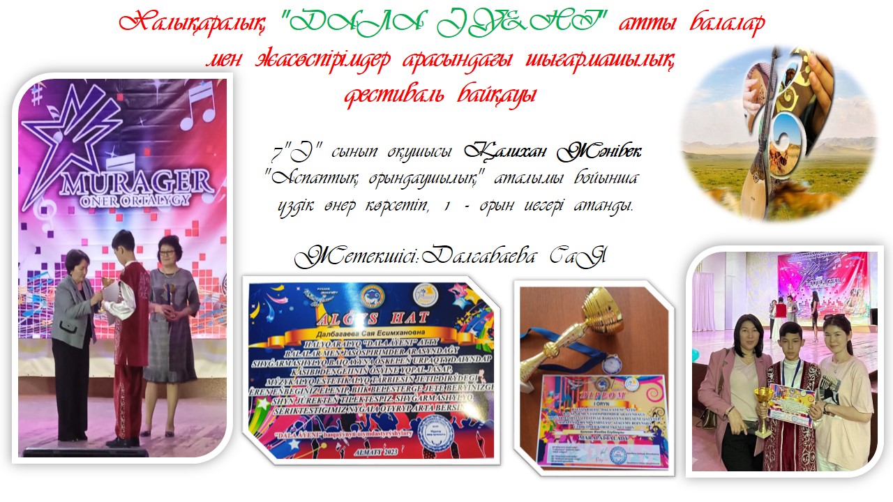 Халықаралық "ДАЛА ӘУЕНІ" атты балалар мен жасөспірімдер арасындағы шығармашылық фестиваль байқауынан мектебіміздің 7"Ә" сынып оқушысы Қалихан Жәнібек "Аспаптық орындаушылық" аталымы бойынша үздік өнер көрсетіп, 1 - орын иегері атанды. Жетекшісі:Далгабаева Сая.