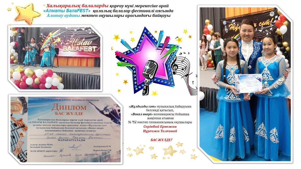 Халықаралық балаларды қорғау күні мерекесіне орай, «Алматы БалаFЕST» қалалық балалар фестивалі аясында, Алатау ауданы мектеп оқушылары арасындағы байқауы «Жұлдызды сәт» музыкалық байқауына