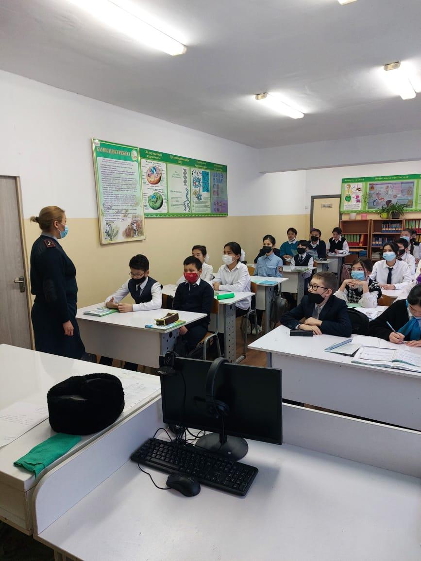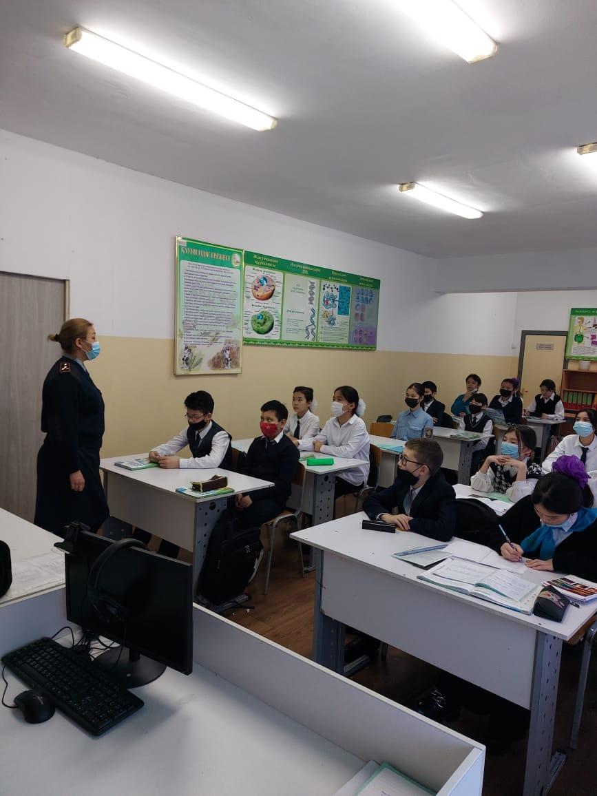 7"А"сынып оқушылары мен мектеп инспекторы А.Алиева "Кәмелеттік жасқа толмағандарың арасында құқықбұзушылықтың алдын алу"тақырыбында түсіндірме жұмыстарын жүргізді.