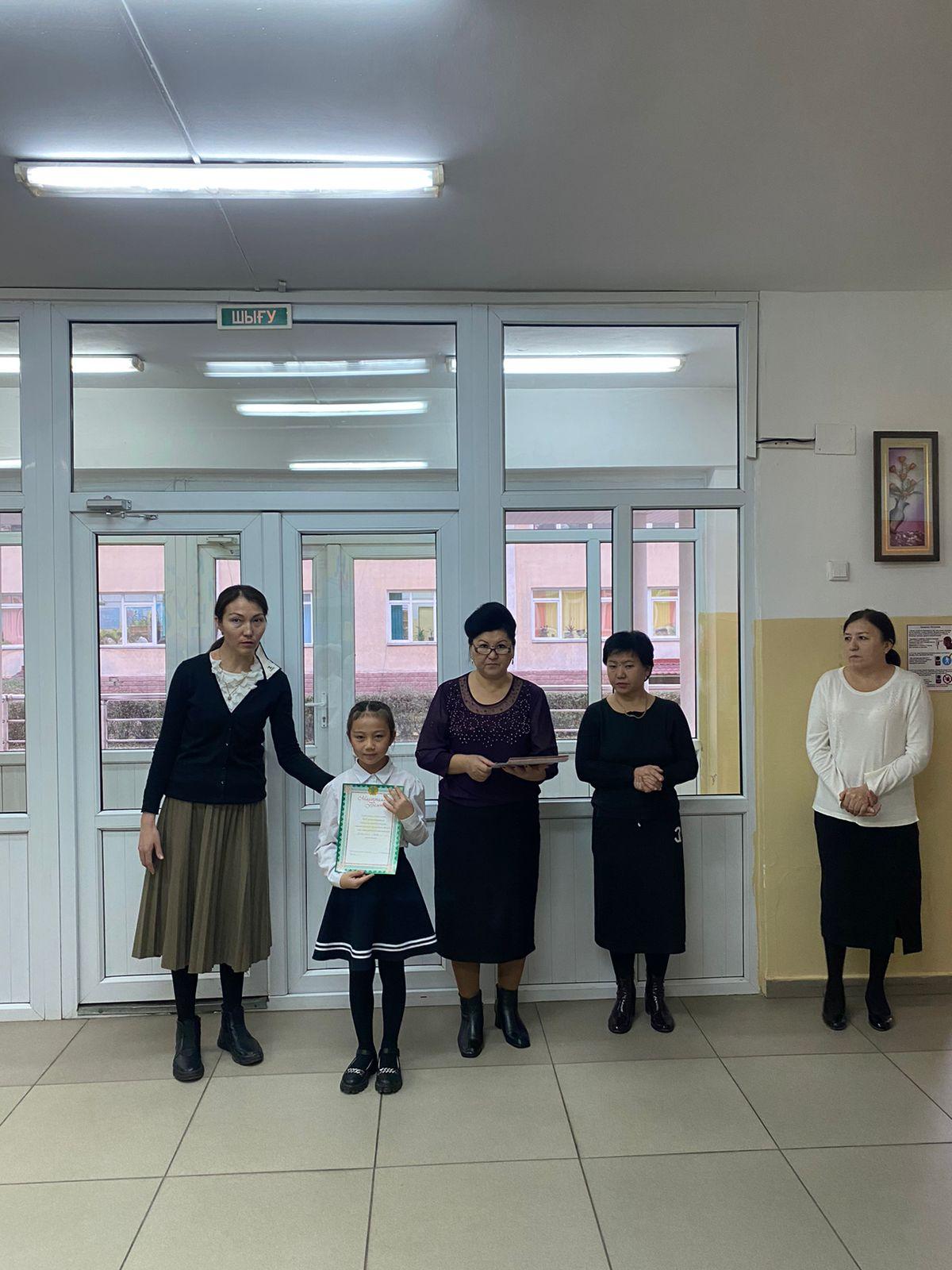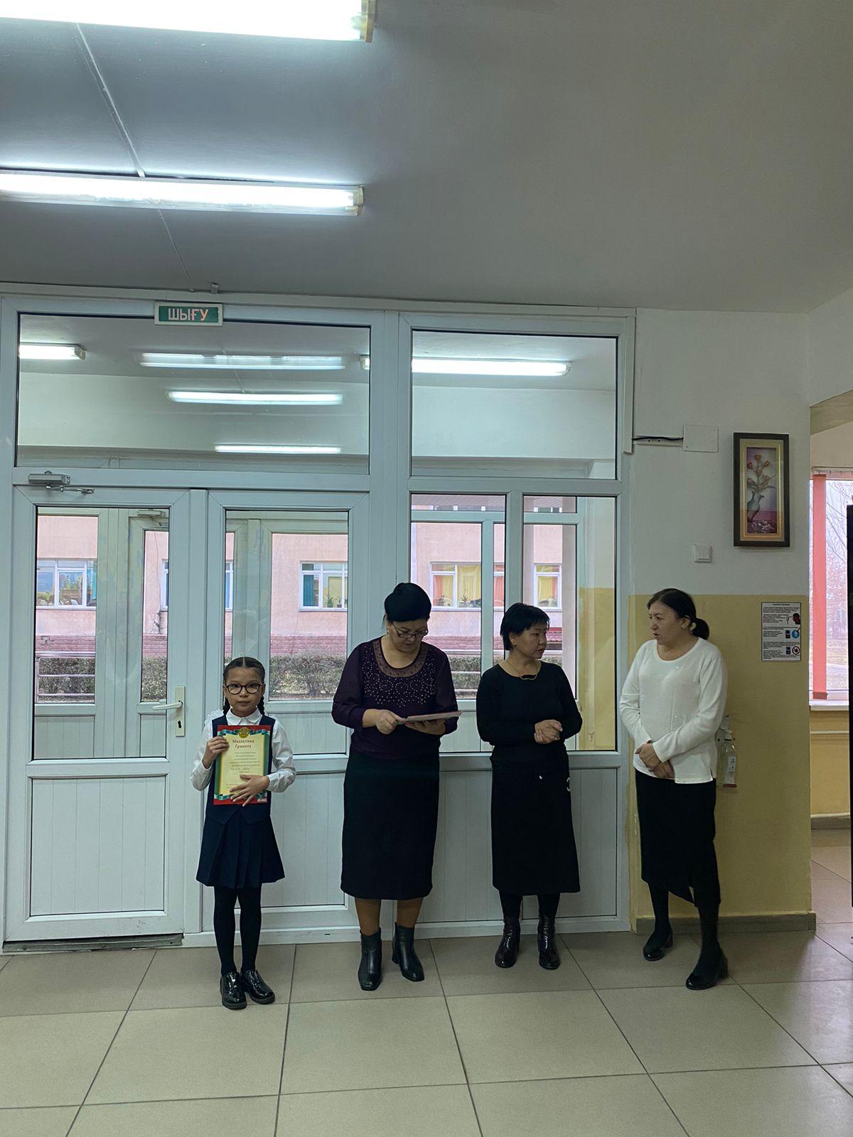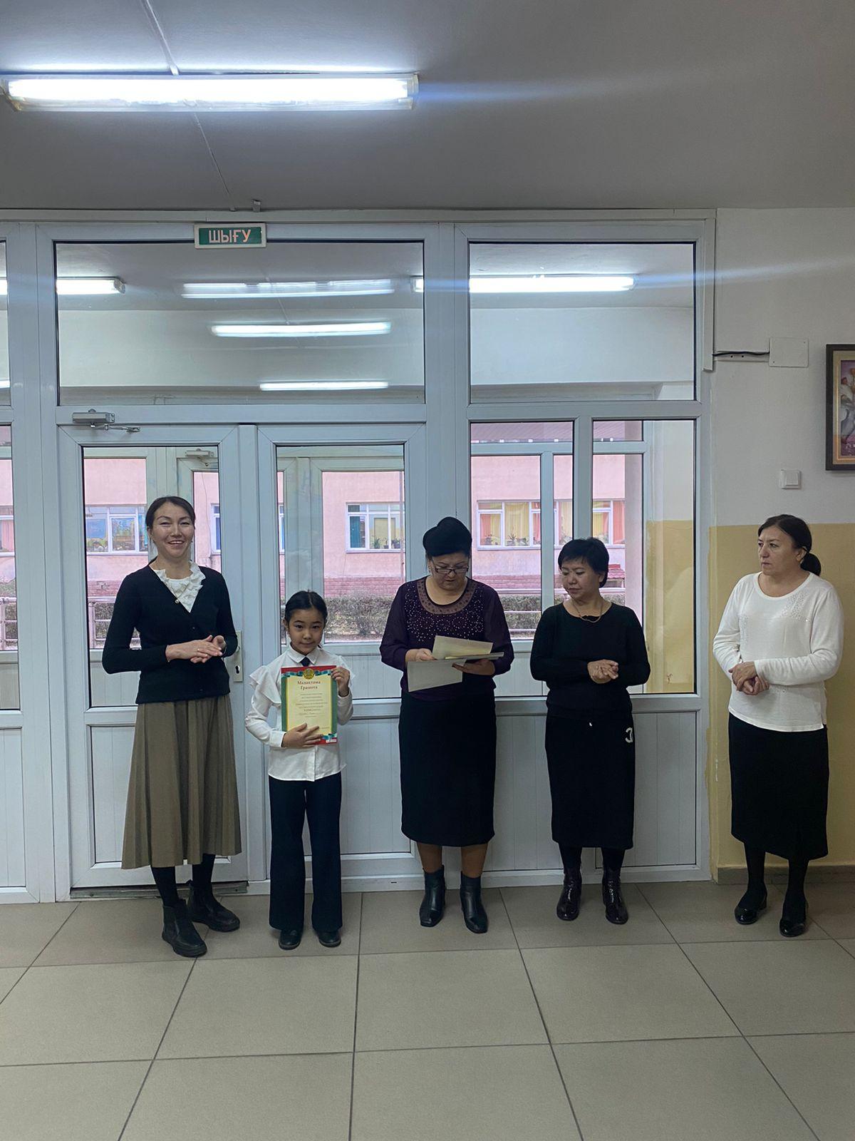 4-сыныптар арасында ұйымдастырылған Абайдың “Қараша, желтоқсан мен сол бір-екі ай”өлеңіндегі көріністі бейнелеу сайысында Бас жүлдені жеңіп алған Марат Марлен,І-орынды Күркебай Ақнұр,ІІ -орындармен Ибдамова Хадия және Ерзаманұлы Бердібек марапатталды