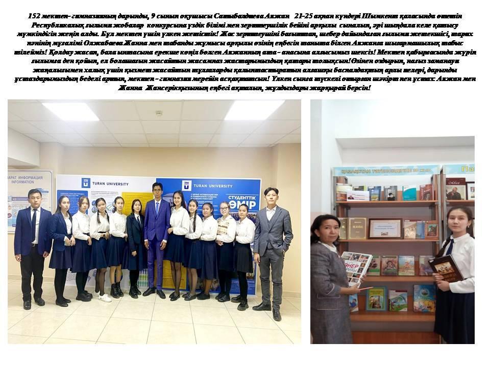 152 мектеп- гимназияның дарынды 9 сынып оқушысы Сатыбалдиева Аяжан 21-25 ақпан күндері Шымкент қаласында өтетiн Республикалық ғылыми жобалар конкурсына үздік бiлiмi мен зерттеушiлiк бейiнi арқылы сыналып,әрі шыңдала келе қатысу мүмкіндігін жеңді