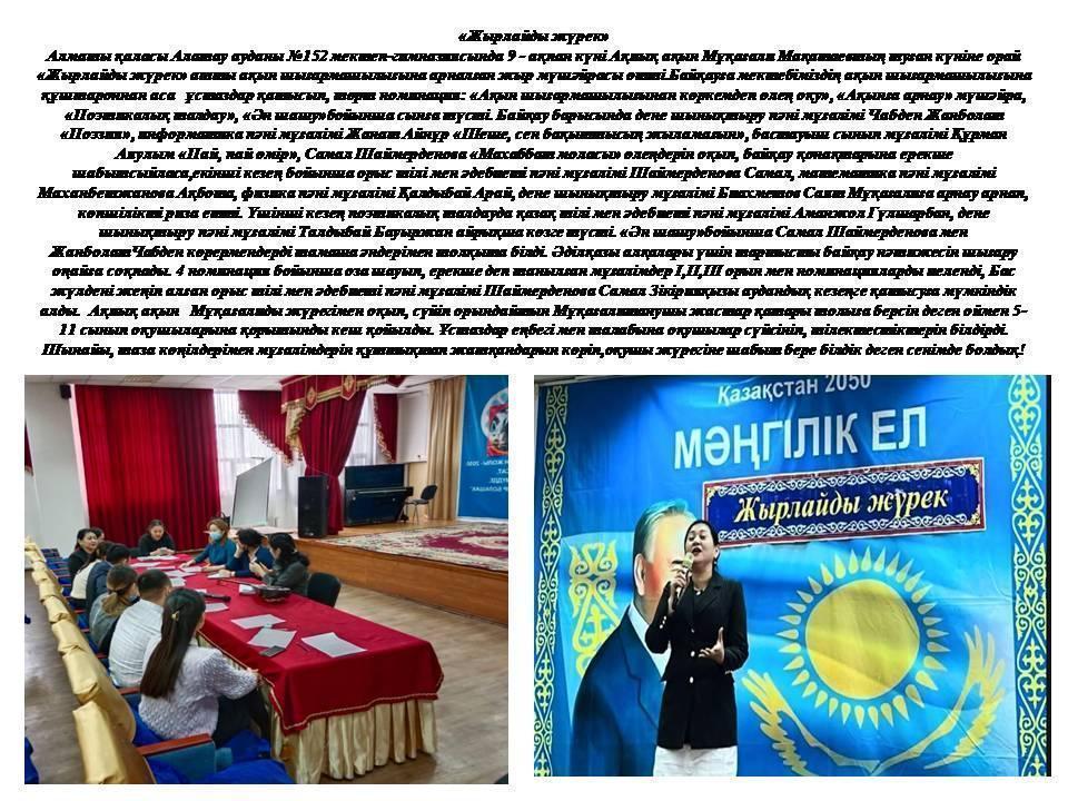 Демонстрационный сайт152 мектеп » Біз туралы » Әдістемелік жұмыстар » Алатау ауданы №152 мектеп-гимназиясында 9 - ақпан күні Ақиық ақын Мұқағали Мақатаевтың туған күніне орай «Жырлайды жүрек» атты ақын шығармашылығына арналған жыр мүшәйрасы өтті.