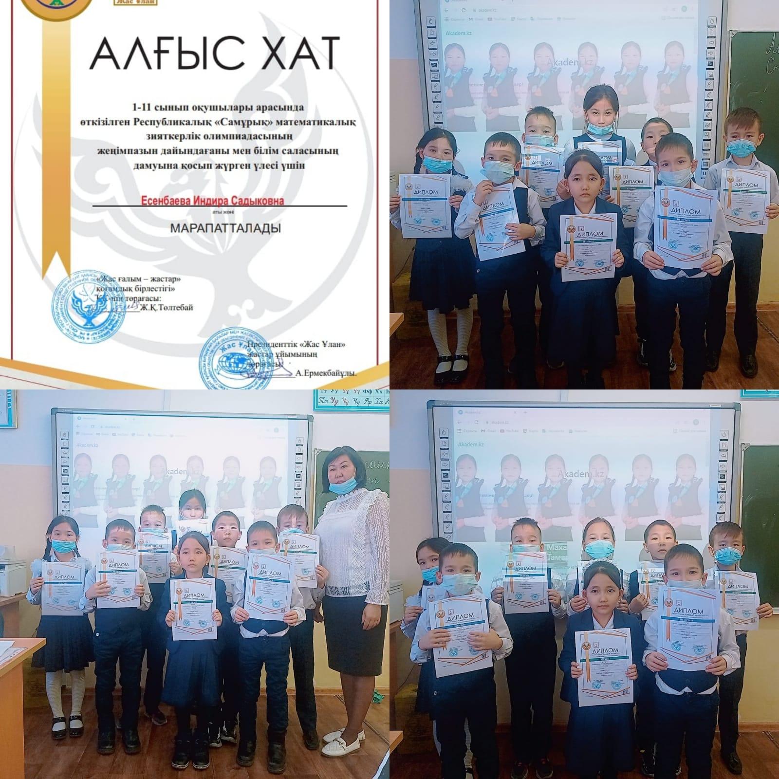 Облыс, қала, аудан мектептерінің 1-11 сынып оқушылар арасында өткізілген "Самрұқ" математикалық зияткерлік сайысы дарынды оқушылардың математикалық қабілеттері мен бейімділіктерін анықтау, оқушылардың математика пәнінен білімдерін тереңдету және пәнге деген қызығушылықтарын дамыту мақсатында ұйымдастырылған жобаға 152 мектеп-гимназиясының 2"В" сынып оқушылары қатысып дипломдармен және сынып жетекшісі Есенбаева Индира Садыковна алғыс хатпен марапатталды. Жеңістерің құтты болсын!