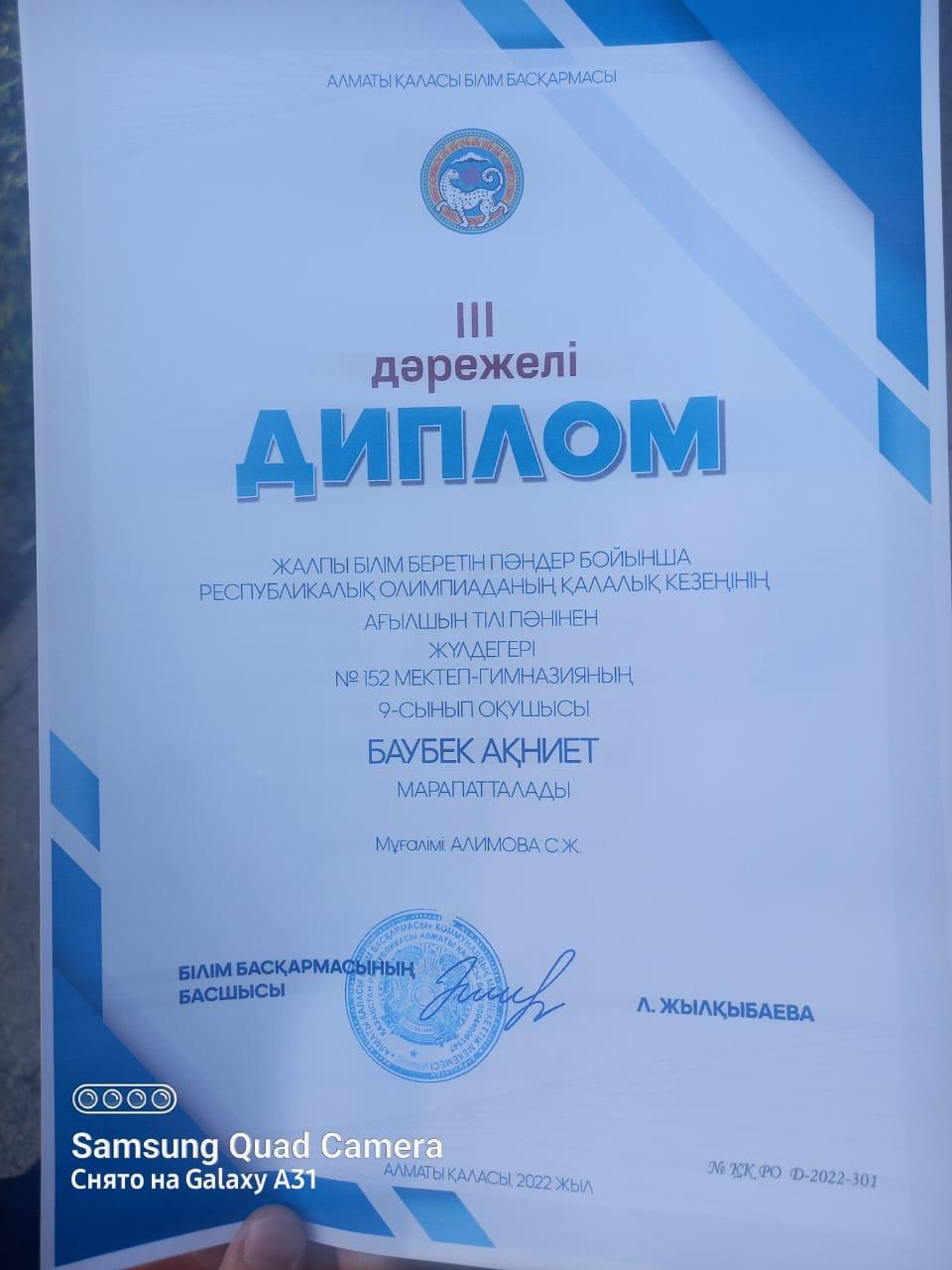 152 мектеп - гимназияның 9 сынып оқушысы Баубек Ақниет қалалық "Дарын" РҒПО- ның жалпы білім беретін пәндер бойынша ағылшын тілі пәнінен өткен олимпиаданың III орын иегері атанды. Өз бiлiмiн дәлелдеген Ақниет пен дұрыс бағыт берiп, шыңдай бiлген пән мұғалімі Алимова Салтанат Женисововнаға ризашылығымызды бiлдiремiз! Бағындырар белестер молынан болып, мектеп - гимназия мерейiн асқақтата берiңдер!