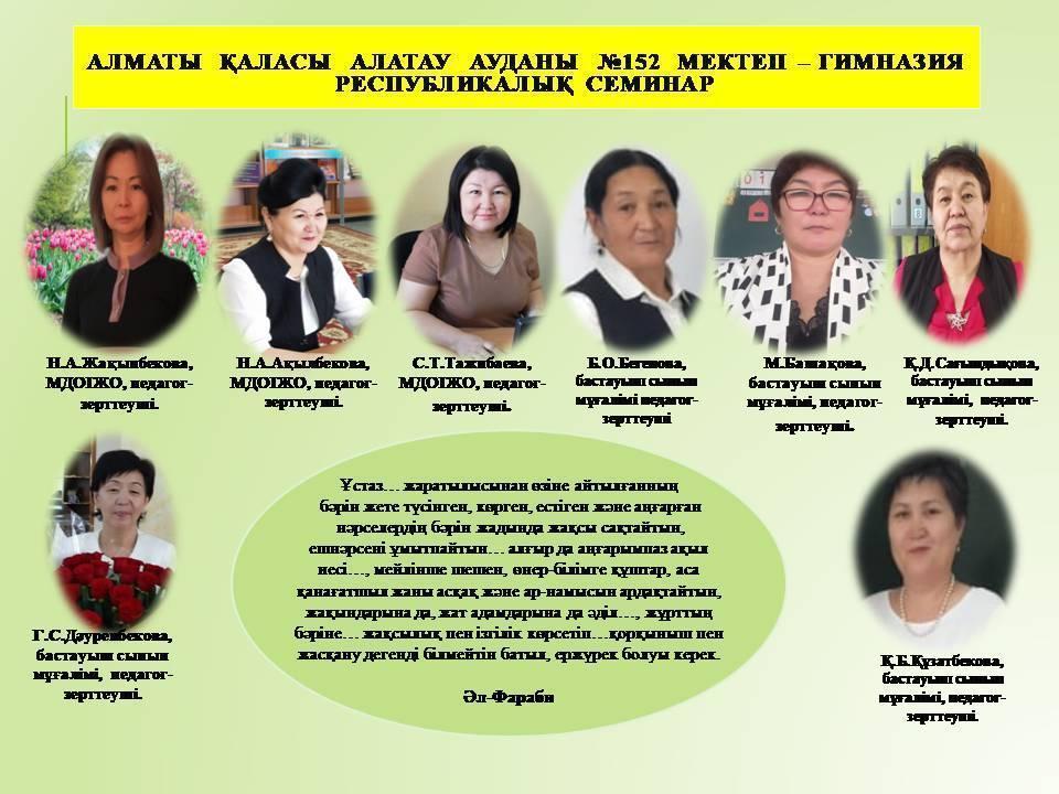 152 мектеп - гимназияда өткен республикалық семинар. Алматы қаласы Алатау ауданы №152 мектеп – гимназиясында "Балалар жылы" қарсаңына орай 1 маусым күні «Мектеп - гимназиядағы оқу - тәрбие процесінің сапасын көтеру және білім алушылардың, тәрбие үдерісін басқарудың заманауи амалдары, бастауыш сынып оқушыларының танымдық қызығушылығын дамыту жолдары» тақырыбында бастауыш сынып мұғалімдері педагог- зерттеушілерiнiңреспубликалық семинары өтті. Семинар қонақтары