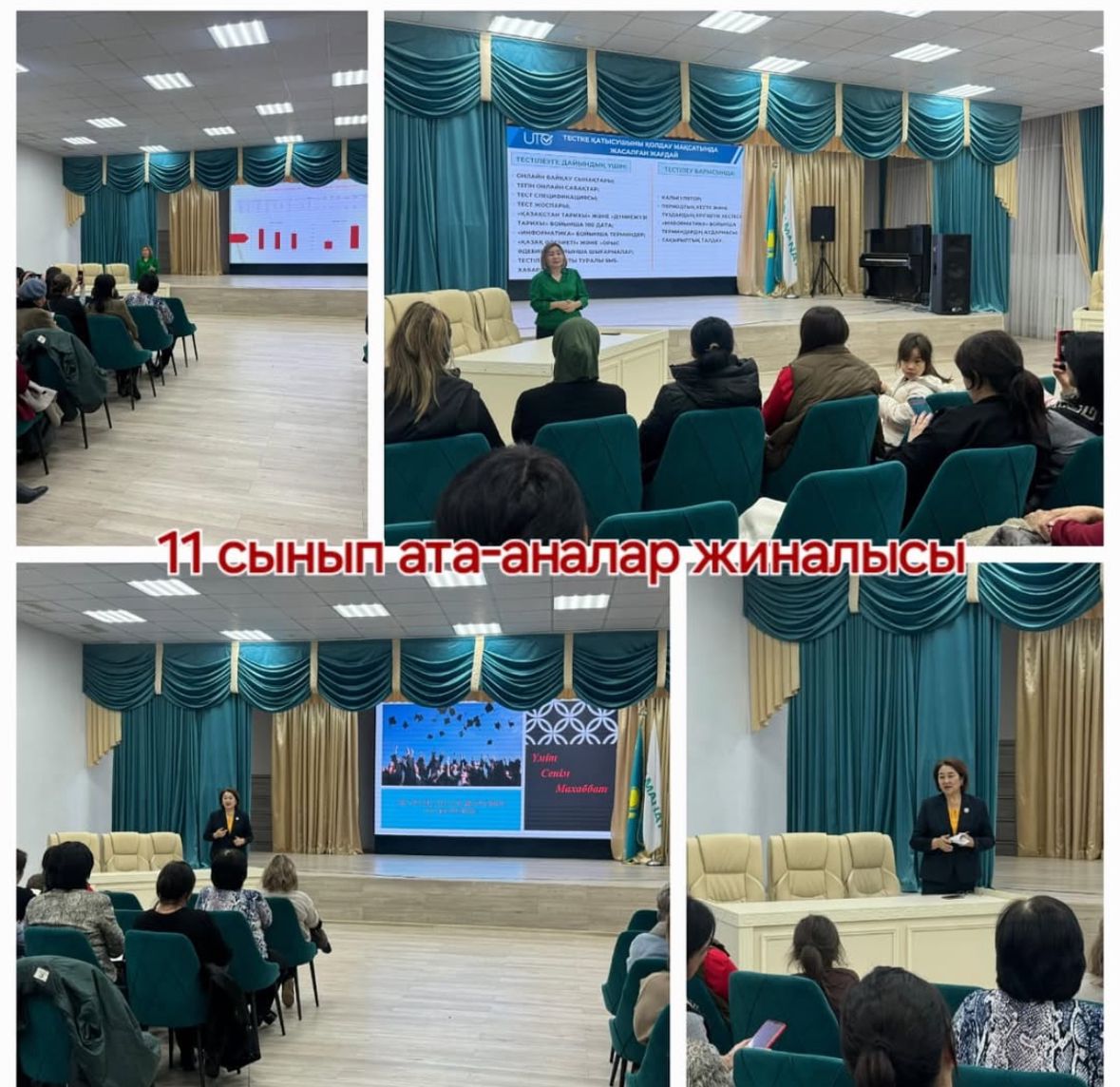 11сынып ата-аналар жиналысы өтті. Жиналыста мектептің оқу-ісі жөніндегі орынбасары Муканова Н.Н сөз алып ҰБТ жайында толық ақпаратпен таныстырды, сонымен қатар сыныптардың сапасы мен үлгерімі жайында айтып өтті.