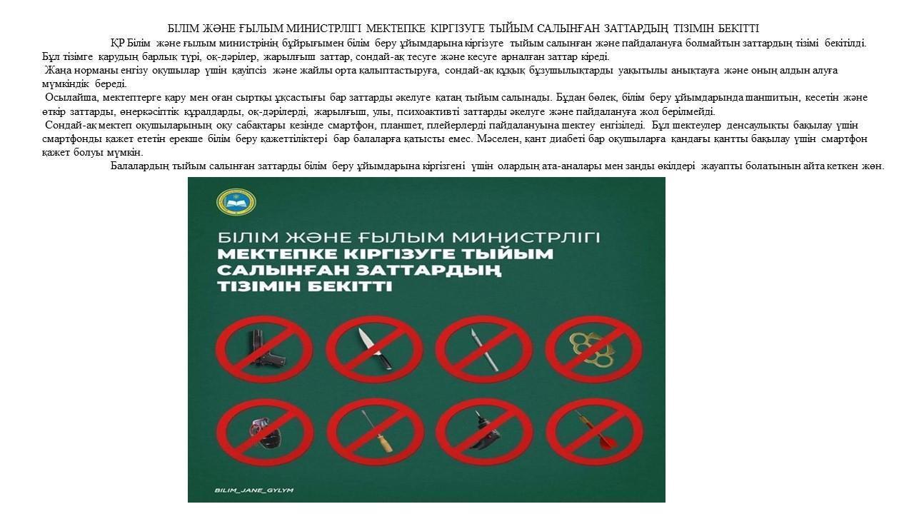 23 июль 2021 0 1 2 3 4 5 БІЛІМ ЖӘНЕ ҒЫЛЫМ МИНИСТРЛІГІ МЕКТЕПКЕ КІРГІЗУГЕ ТЫЙЫМ САЛЫНҒАН ЗАТТАРДЫҢ ТІЗІМІН БЕКІТТІ Осы беттің QR-коды:QR-код этой страницы: